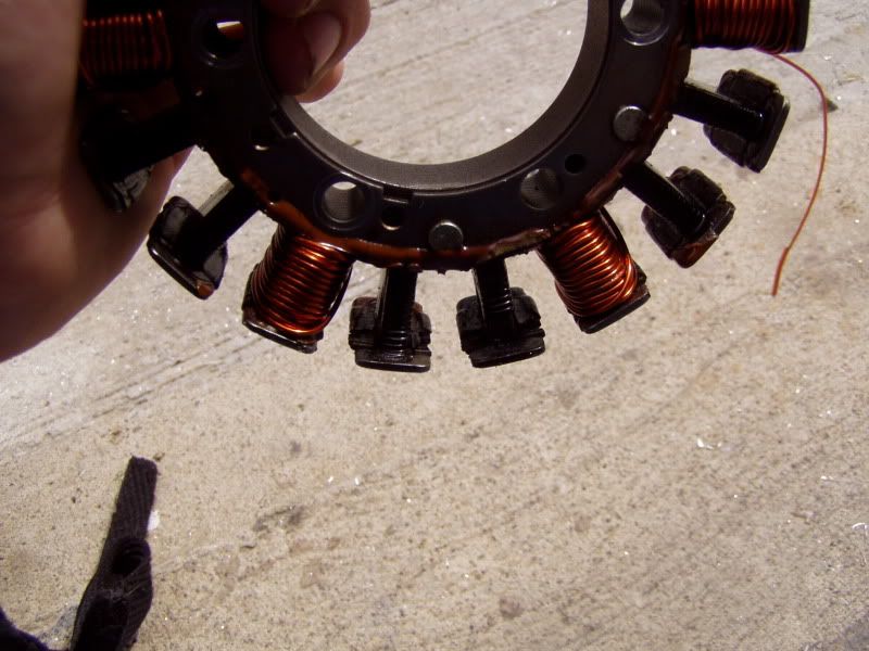 here's pics of the 1st stator. The tech admitted that he shouldn't have used the metal clamp to hold the wires in place ( as you can see it burnt out the wires, and probably some of the poles.